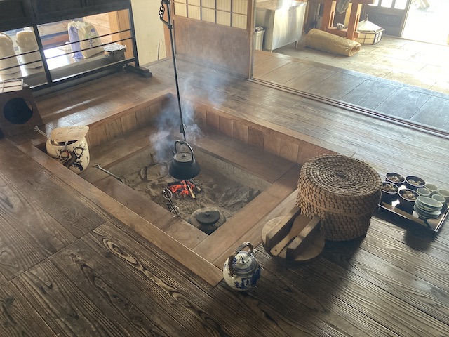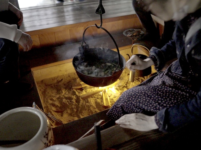 囲炉裏の火で鍋調理を行った。
