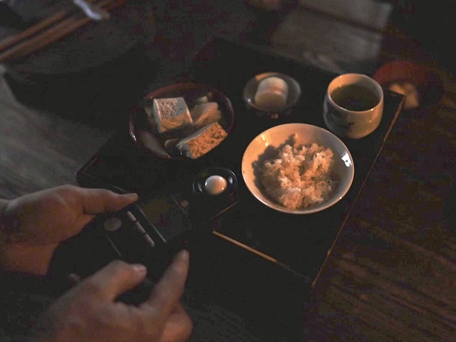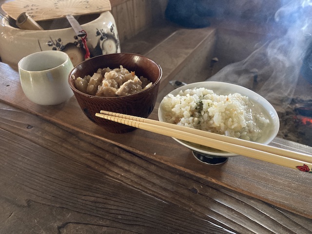 湯が沸いた所で、囲炉裏を囲って朝食を取った。