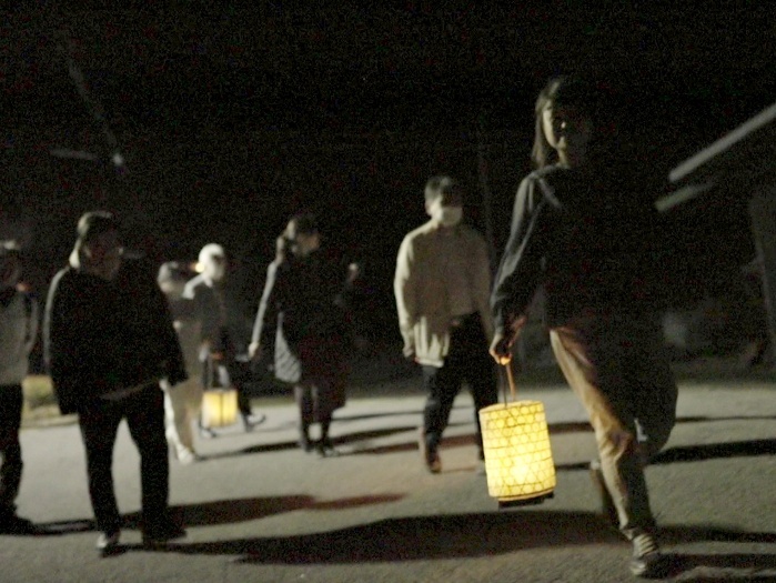 日帰りコースが終了し、近くのバス停までの道のりを籠提灯と提行灯のあかりでお見送りをした。