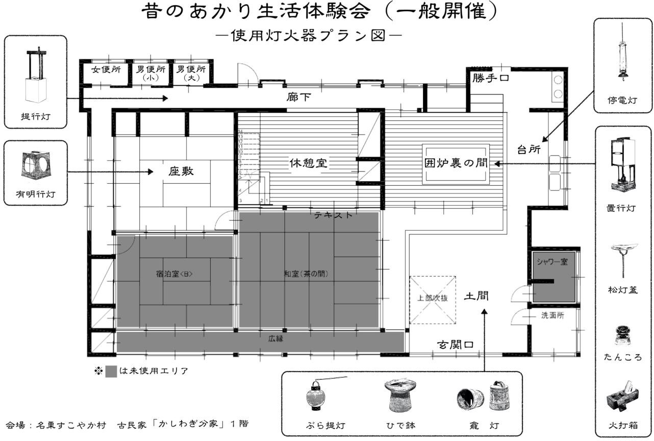 - 折角に山村文化が残る古民家を利用させて頂く事ができるので、使用する灯火器は一部山村でも使われていた灯火器を選別した。