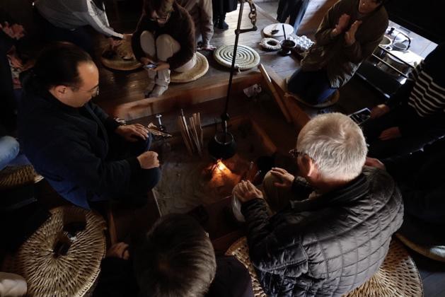 参加者の内から代表で1名の方に火打箱にできた火種から付け木を使って囲炉裏に火を入れて頂いた。囲炉裏の自在鉤には鉄瓶をかけて、お湯を沸かした。