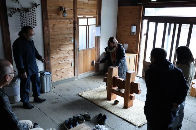 前回は油搾り体験時に気がつかぬ間に油がこぼれて建物に油染みをつけてしまった為、今回は油を置く場所を制限した上でスタッフの監視の元で油搾り体験を行った。