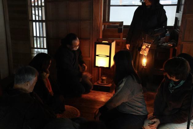 夕食のスイトンができるまでの間、座敷に移動して有明行灯の説明の後にあかり体験をして頂いた。(安全の為に光源は3本灯芯の灯明のあかりを再現した特注 LED 光源を使用)