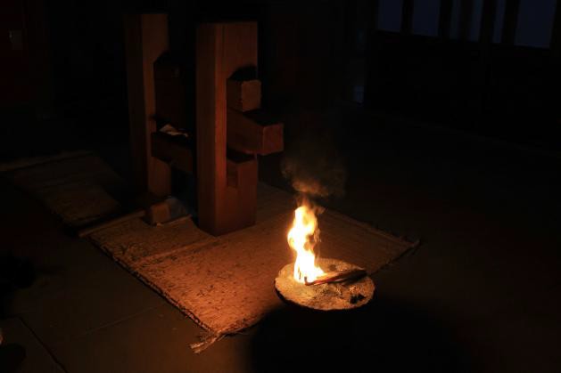 火打箱で火打ちをした際に出る火花が床板に落ちると床の杉板が僅かに焦げる事を実験にて確認した為、今回は円座の上で火起こしをする事で対策をした。