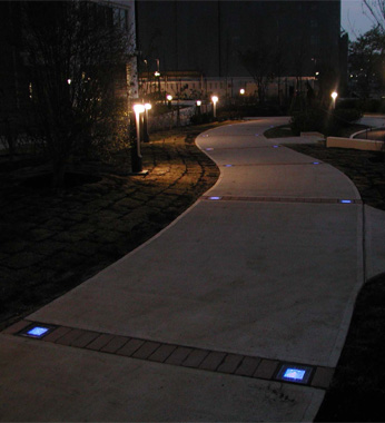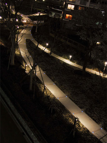 さらに横広がりのワイドスパン配光と高効率のセラミックメタルハライドランプを組合せる事で安全・安心の為の十分な照度を確保しながら、省エネを実現している。通路沿いに、ソーラー青色のLEDブロックを配置し視線誘導効果といやし空間の演出を実現した。