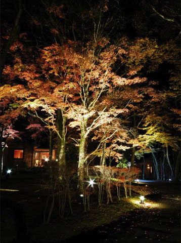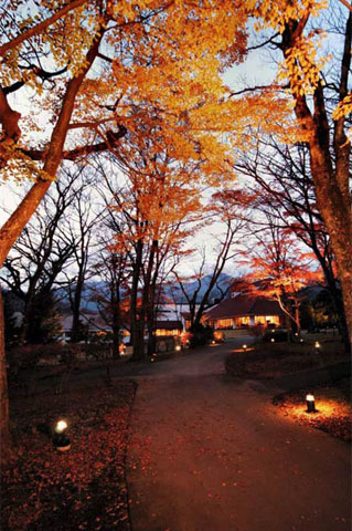 コテージから本館を臨む コテージ通路におけるライトアップ