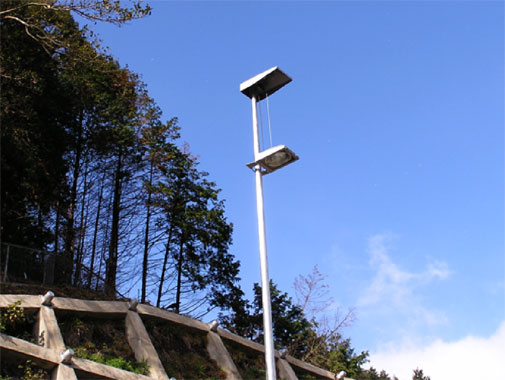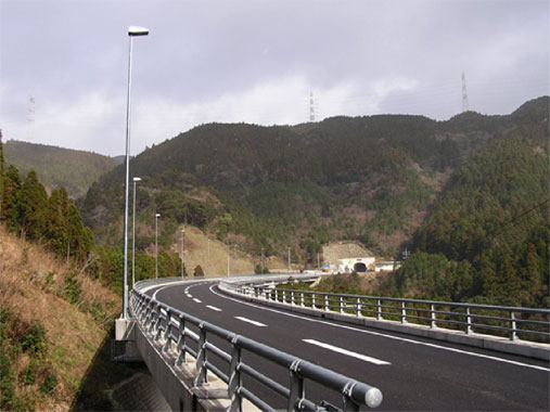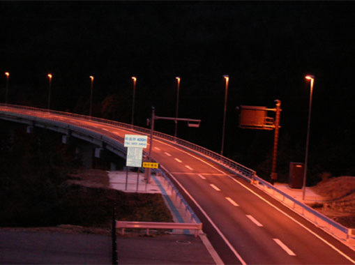 道路は山間部を抜ける橋梁で、照明灯は橋梁地覆部より張出基礎を設けて橋梁外に建柱をしています。よって、ランプ交換,清掃等メンテナンス作業の効率化と安全性の確保および、高所作業車を使用することによる交通規制の緩和を目的として、道路照明灯に昇降装置を設置しています。