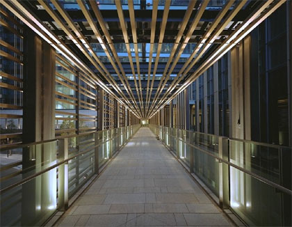 ビッグ・キャノピーと檜町公園とをつなぐブリッジにはアッパーライトを採用。ブリッジのディテールを浮かび上がらせています。