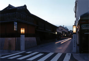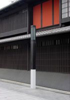この花見小路の照明灯には、四条通り側にシンボル灯、通り沿いには街路灯と2種類のデザイン灯を配置し、全て格子の灯具と白御影石の袴を組合せ、重厚で美しい外観を生んでいます。それぞれの灯具には、銅板製で出来ており、今後経年とともに赤橙色から、次第に褐色へ、そして最後には銅特有の緑青色へと色調を変化させ、千年の古都にふさわしく美しい照明灯へ変わっていきます。