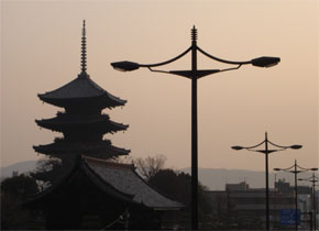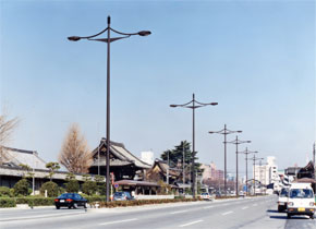 大阪方面から国道1号線に出ると、世界遺産であり、古都京都の文化財でもある東寺の五重塔が目に入ります。この東寺に隣接した国道1号線には、京都のシンボル五重塔をイメージしたデザインの道路灯が設置されています。アームは、塔の屋根をイメージした弓なりのしなやかな形状で、ポールの先端は相輪形、色味は品格ある焦げ茶色と、景観に溶け込むデザインになっています。