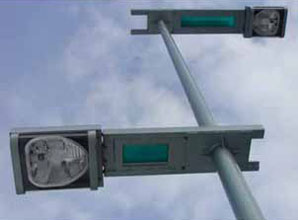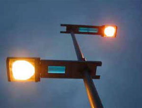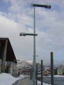 光源にはナトリウムランプの暖かみのある光と車道及び歩道照明柱のアーム部にLEDを内蔵させ、LEDが点灯するとパネ