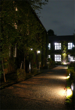 本館を引き立てるよう、明るさを抑え、足元灯で建物をライトアップしています。