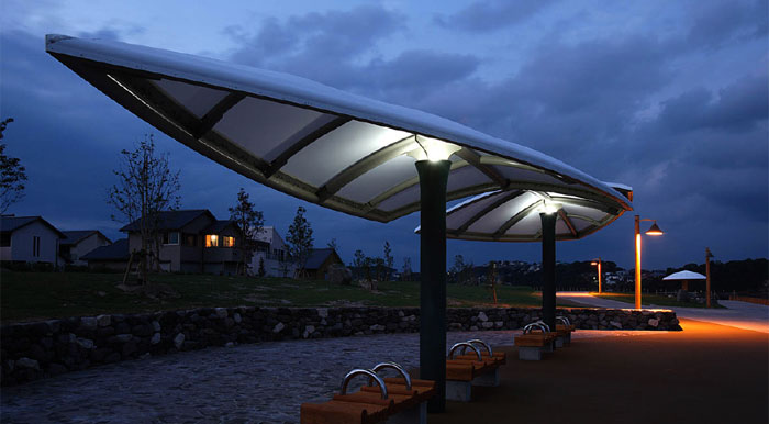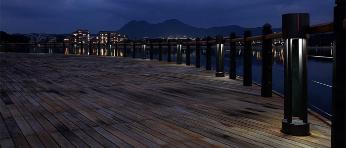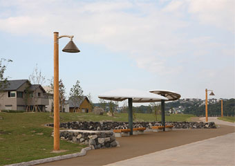 外周歩道、遊歩道のメイン通路は、周辺環境に光害とならないように、灯具の形状を傘型タイプとし必要範囲だけを照らしあげ、環境と人にやさしい照明空間を演出しています。また、昼間も景観性に強く影響するストリートファニチャーであるため、素材の選定では、豊かな自然の創造と環境共生を表現させるため、照明柱には耐久性のある木材柱を使用しています。