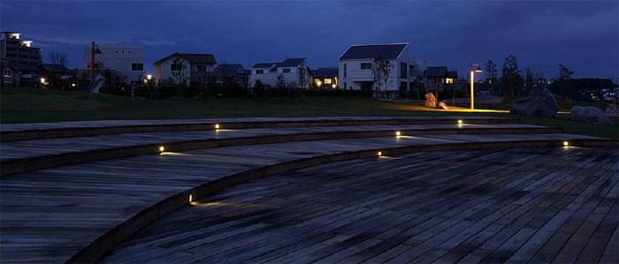 夜の景観はきめ細かく配置された小さな光で樹木階段やボードデッキを美しく照明し、安らぎと潤いのある空間を演出しながらも、足元は必要最小限の明るさを確保し、自然と人にやさしい明かり空間を提供しています。