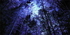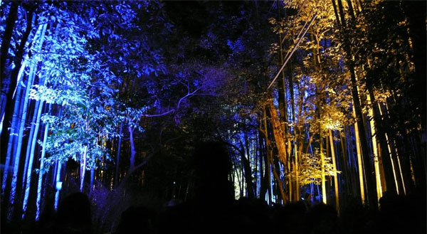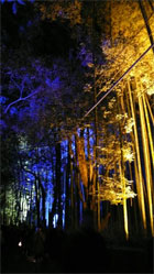 竹林をライトアップした照明器具 ライトで照らされた竹林の葉 竹林