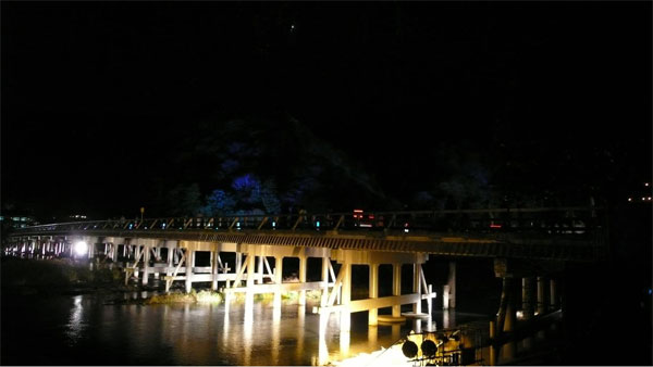 ライトアップにより橋の支柱が際立ち、背景にそびえる嵐山との風景が光により浮かび上がっていました。