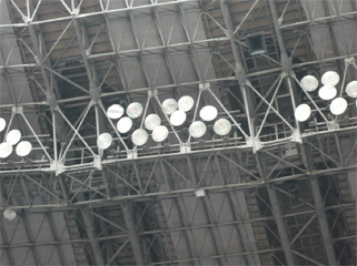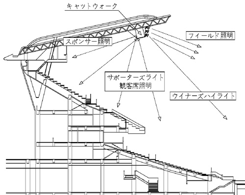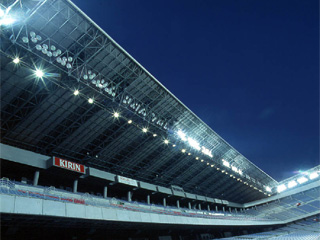 フィールド照明には高演色形メタルハライドランプ2.0KWを824台採用、6種の点灯パターンで運用され、プロサッカー時は平均照度1500ルクス、ゴール前2000ルクスを確保、その他にサポータズライト,ウイナーズハイライト,スポンサー照明など多様な照明を配置し、利用者に快適な光環境を提供しています。
