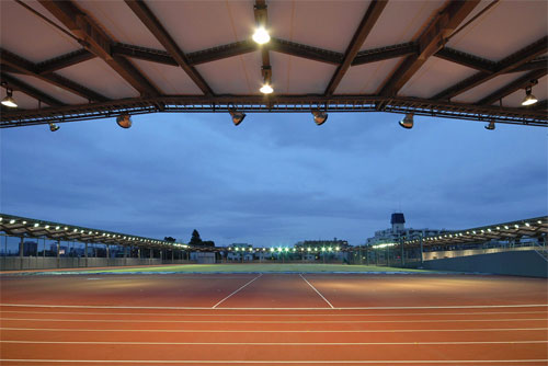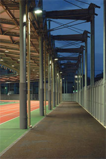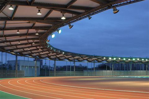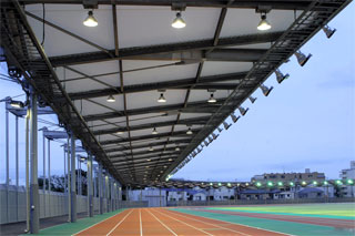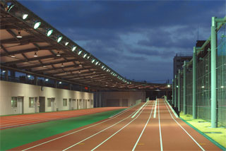 屋根付400mトラック直線コースの照明 傾斜走路の照明