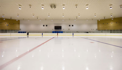 このエネルギーの活用によって1年を通して使用することができる屋内スケートリンクの照明には、グレア(眩しさ)を抑えた多面形状の反射鏡を持つ高天井照明器具を設置しました。光源にも、屋内リンクで行われる様々なスポーツを考慮して、低誘虫効果が期待できるUVカット形のメタルハライドランプを採用しました。