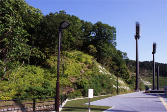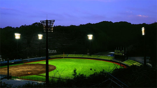 硬式野球の公式競技対応として照明塔を6基設置し、内野1,500lx、外野800lxの照度を確保している。使用光源は演色性の良いメタルハライドランプ(Ra65、4,200K、定格寿命9,000h)と効率が高く長寿命である高圧ナトリウムランプ(Ra25、2,100K、定格寿命12,000h)を採用して、グラウンド内をカクテル光線で照明している。また、周囲の山林に配慮して誘虫性の低いUVカットタイプのメタルハライドランプを採用している。