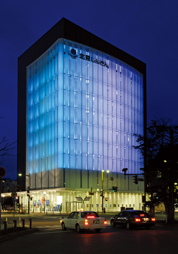 地域活性化を願い計画された北見信用金庫のファサードです。北見の風土を表現した流氷と青空をイメージしたダブルスキンの外壁はタペストリー加工等を施した白色ガラスと濃紺色の太陽光発電パネルで構成されています。3F~9Fのダブルスキン内の歩廊部分にデジタル制御カラーLED投光器133台を設置し、ガラス壁を巨大なライトボックスに仕立て上げています。年間を通じてタイマーによりグラフィックパターンを表現できるようにプログラムされています。