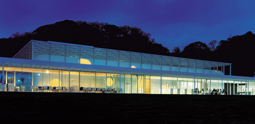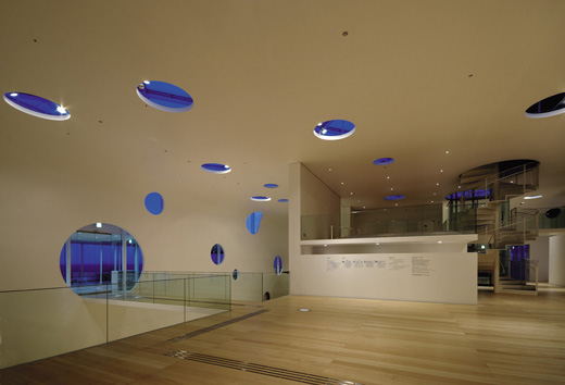 横須賀美術館は、2007年市制施行100周年を機に建設されました。海と山の入り組んだ三浦半島の地形と豊かな自然環境を保持しながら、海と向き合うように建てられています。日中は天井や壁に開けられた丸穴から自然光が降り注ぎ、開放的なエントランス空間を作り出しています。照明器具は全て丸穴に沿って設置され、この特徴的な建築デザインを損なわないように配慮されています。夕暮れになると室内は照明の光で満たされ、丸穴は昼間と異なる色彩のコントラストを作り出します。