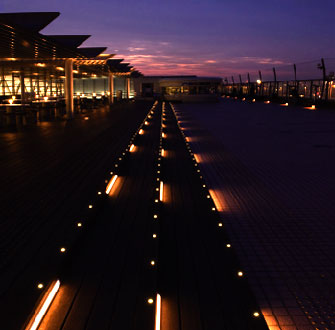 ウッドデッキ階段の蹴上げの部分に、約3mピッチでLEDライン器具が取り付けられ、点で光る光ファイバーと一緒に足元の安全を確保するとともにリズミカルで生き生きとした景観を創りだしています。