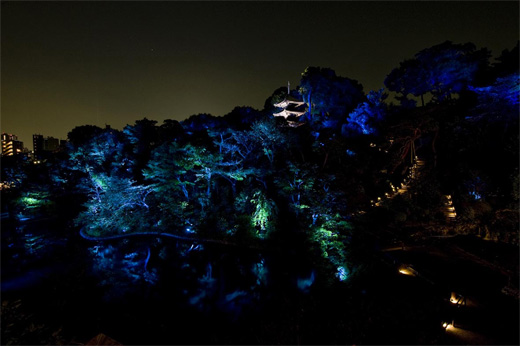 東京 文京区にある椿山荘は、130年前に山縣有朋によって築庭されました。庭園規模約2万坪(東京ドーム1.5倍に相当)で、樹齢約500年の樹木も有する歴史ある広大な椿山荘の庭園を、LED・セラミックメタルハライドランプを使用し、消費電力を従来の庭園照明よりも約半分に抑えた省エネ設計でありながら、「庭園光響曲」というコンセプトの下、庭園全体を光と音による迫力ある演出で幻想的な庭園演出を創出しています。