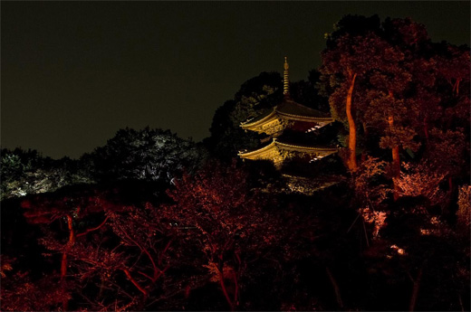 写真2:三重塔の照明は、メタルハライドランプ575W/150W投光器・LED139W投光器を使用し演出を行なっています。