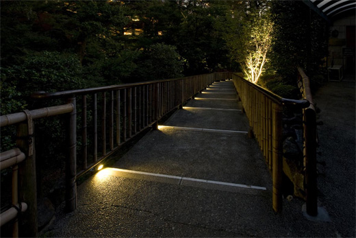 園内の遊歩道照明は、昼間の庭園の景観を損なわないようコンパクトな器具で、演出照明の邪魔にならず、また歩く人に対してはグレアを感じない足元のみを照らすやわらかな光のLED庭園灯を配置しています。