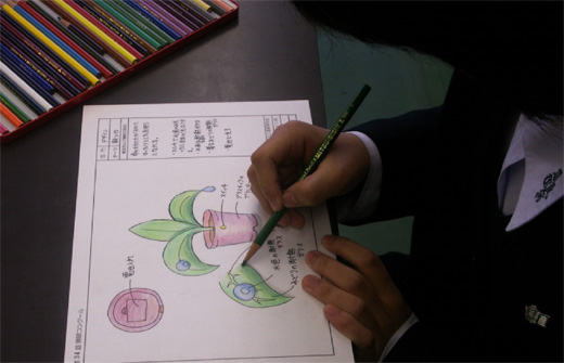 「これで何回塗ったの?」と児玉先生。「今で3回目です」と丹念に筆を重ねる生徒さん。記者:「何処に置くんですか?」 生徒さん:「おばあちゃんにプレゼントしたいんです」。何でも写真の作品の縦の細長い枠はお母さんが100円ショップで買ってきてくれたもの。でも、頼んだ形のものと違っていたらしい。でも、折角買ってきてくれたんだからと、カッターナイフで削り直してから製作に取りかかったらしいです。家族の気持ちを大切にする優しい生徒さんでした。