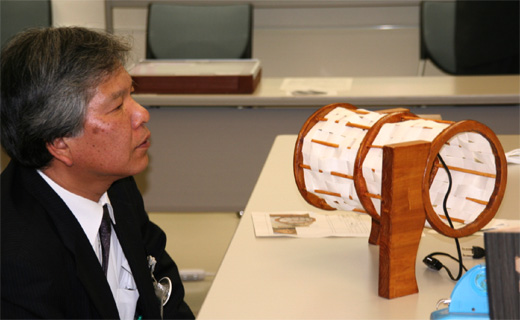 今回の応募点数は各高校での学内予選を通過した1,152点です。アイデア部門、デザイン部門と審査が進んで行きます。そしていよいよ最後の製作部門では会場を真っ暗にして1点ずつ作品を点灯させます。本来の雰囲気に出来るだけ近づけて、あかりの雰囲気を審査します。