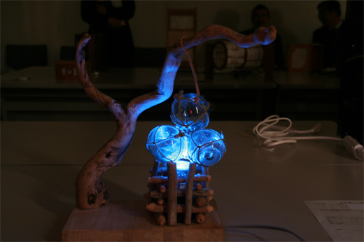 地震発生直後、避難誘導灯があれば、短時間に安全に誘導することができる。そこで、家庭において照明器具と誘導灯を兼ね合わせた器具があれば便利であると考えて製作。通常時は室内照明として使用し、地震時には自動的に点灯し、誘導してくれる仕組み。