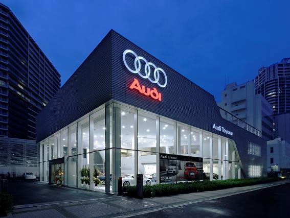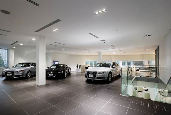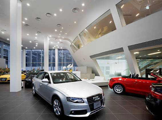 『アウディ豊洲』はアウディ社が発表した新しいコーポレートデザインによる日本初のショールームです。アウディカーブと呼ばれる白い壁面が空間の中央に円弧を描き、新しいアウディデザインを象徴した構成にしています。ショールームは、高照度高色温度の設定で水平面照度1000lx、色温度4200Kのランプを使用しています。