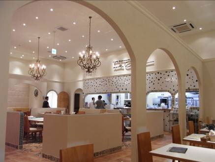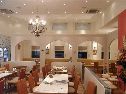 白色の内装が清潔感を醸し出し、天井が高く、開放感あふれる空間のレストランです。 照明計画としては、全体的に明るく照らし、壁面にブラケットなどを使用し明るく開放的な 空間を演出しています。