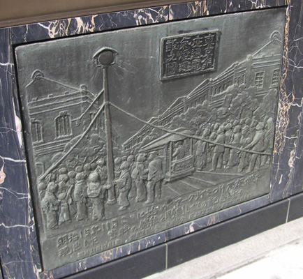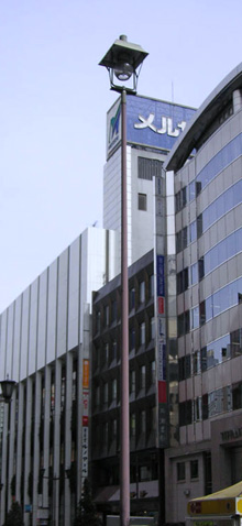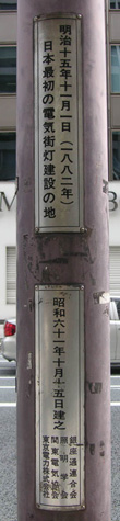 「日本最初の電気街灯建設の地」と記念して関係者の手によって昭和31年10月1日にこの銀座記念灯がたてられた。