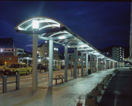 和歌山県のJR海南駅前広場では、周辺の美観改良の一環として バス停留所のシェルターに寿命60,000時間の無電極放電ランプ(85W)を使用した照明器具を採用し、駅前も明るく照明され、さらにランプ交換コストと電力量の軽減に繋がりました。