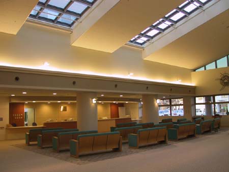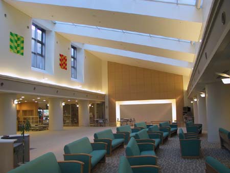 施設概要 岩内病院は、地下1階、地上7階、246床の規模で、岩内港に近い町の中心部に建てら れた地域の医療を担う病院です。西後志地域における基幹病院として地域に密着した医療を特色としています。 パブリックスペースや病室、ナースステーションなどパブリックスペースでは、3000kの低い色温度のランプを使用することによって、暖かみのある落ち着いた雰囲気の空間を作っています。また、FHF32W器具を診察室や事務スペースのベースライトとして使用し、快適な視環境と共に省エネにも留意した設計となっています。 エントランスホール 入り口を入ると天井が大きく吹き抜けた大空間が広がります。昼間はトップライトから 昼光が振り注ぐ開放的な空間が、夕方からは間接照明によって落ち着きのある空間に変化します。柱には反射板を備えたブラケットを設置し、空間に光のポイントを作ります。 病室 ベースライトは空調などの設備機器が集中する中央の天井でもスペースをとらない ダウンライトを使用。このダウンライトは患者からのグレアに配慮した遮光角45°の設計となっています。また、壁面にはアッパーブラケットを設置し、ベッド周りと天井面の明るさを確保しています。 |