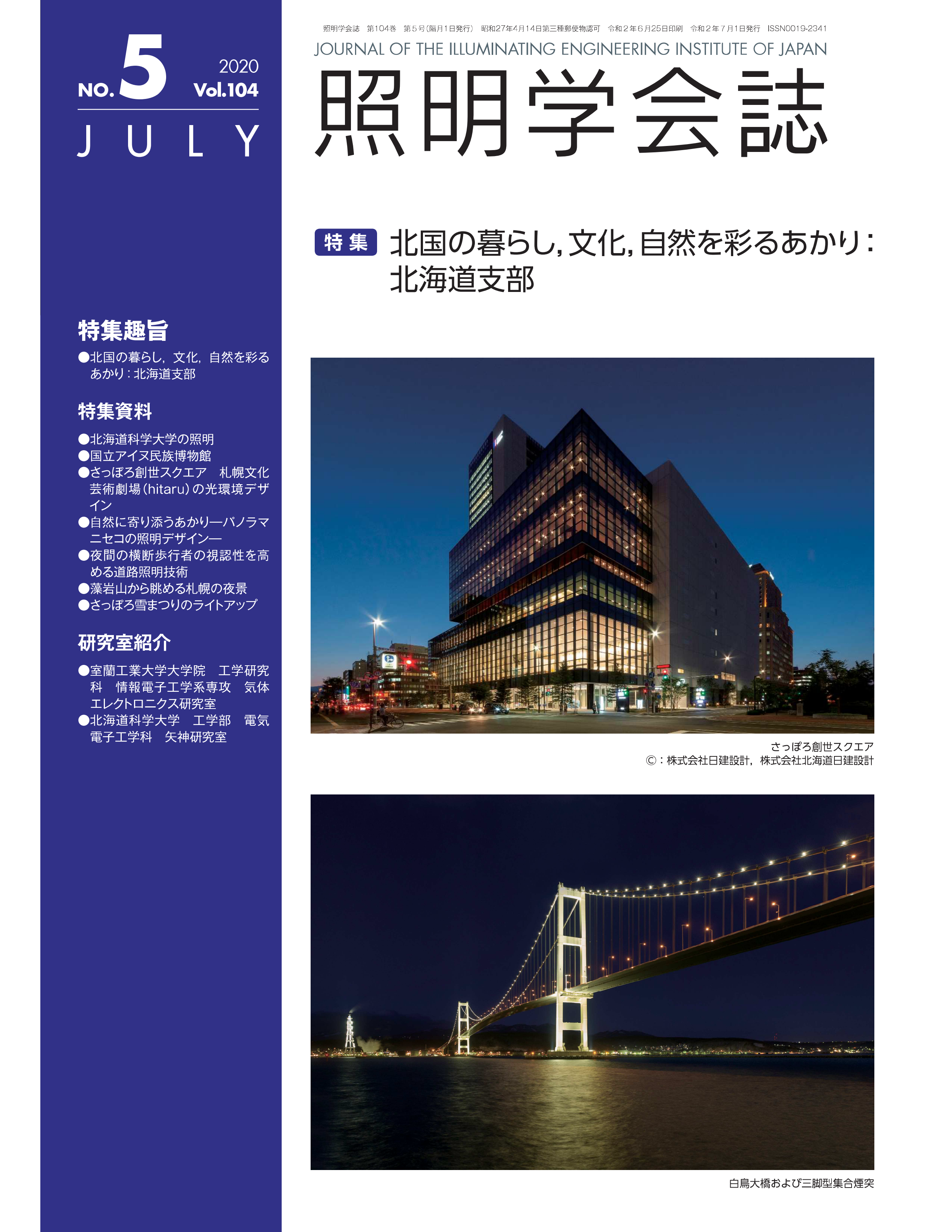論文号の全文はこちら(J-Stageのサイト)からご覧いただけます。 照明学会誌Vol.104 No.1 特集 国内外で評価された 照明デザイン2019 照明学会誌Vol.104 No.2 論文号 照明学会誌Vol.104 No.3 特集 光源・照明システム技術の展望 照明学会誌Vol.104 No.4 特集 照明学会誌の編集 照明学会誌Vol.104 No.5 特集 北国の暮らし,文化,自然を彩るあかり 照明学会誌Vol.104 No.6 照明年報 照明学会誌Vol.104 No.7 特集 防災照明