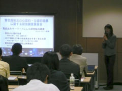 まず、開会の辞に代えて、研究調査委員会と公開研究会開催への経緯について、委員長の溝上陽子氏(千葉大学)から説明があった。その後、北村薫子氏(武庫川女子大学)の司会進行のもと、6件の講演が行われた。最初は名取和幸氏(日本色彩研究所)による講演「青の色彩心理-基本的な知覚効果と色彩感情」で、心理学の分野における様々な「青色」のイメージや効果が紹介された。次の高橋良香氏(千葉大学)による講演「光がヒトの生体に及ぼす作用について」では、短波長の光が、生体リズムに関係するメラトニン分泌等の生理的反応に与える影響について解説された。3番目は望月悦子氏(千葉工業大学)による「分光分布と不快グレア」で、現行の不快グレア評価法の解説および光色や分光分布が不快グレアに与える影響についての研究紹介が行われた。休憩をはさんで行われた山口秀樹氏(建築研究所)による講演「照明光色と視覚・空間印象」では、有彩色照明環境での色の見えや印象等に関わる研究が紹介された。その後、井上容子氏(奈良女子大学)による講演「青色防犯灯の現状」で、青色防犯灯の波及経緯と様々な検証実験・調査の結果が紹介された。最後の溝上氏による「調査報告・青色自殺防止灯の現状」では、鉄道駅・踏切における青色自殺防止灯の波及経緯と委員会が独自に実施したアンケート調査の報告が行われた。