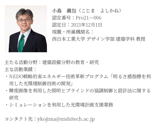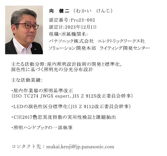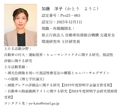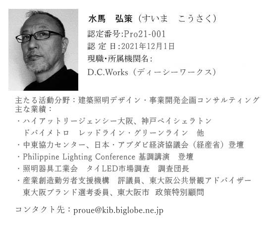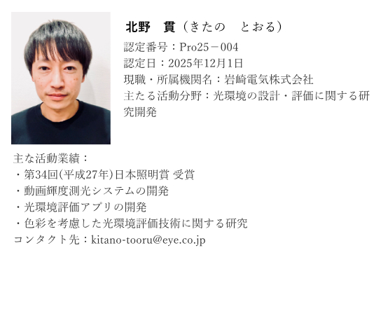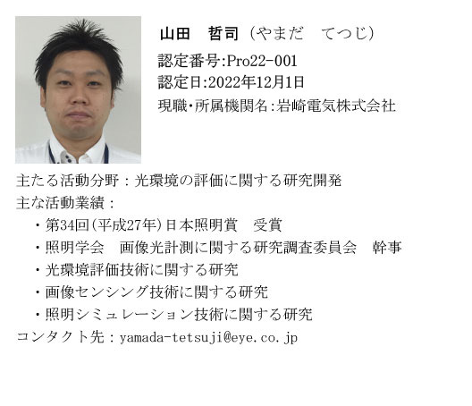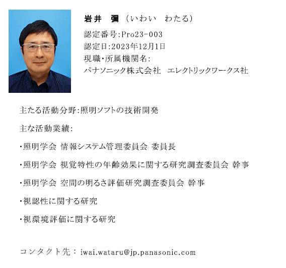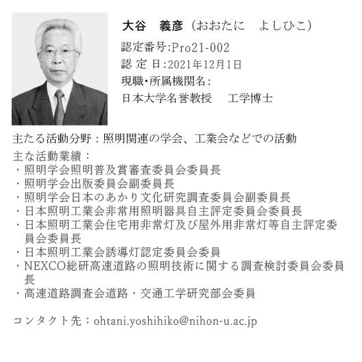 2010年度より照明分野で活躍し実績を挙げている会員を対象に,照明のプロフェッショナルであることを社会に広く知ってもらうための「照明プロフェッショナル」認定を行っています.そして「照明プロフェッショナル」を社会に広く紹介し,その活動を学会が種々の行事を通して支援していきます.