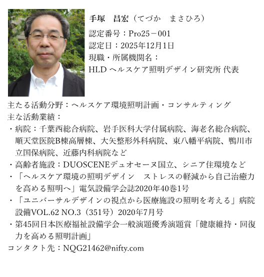 手塚 昌宏 | てづか まさひろ | HLD ヘルスケア照明デザイン研究所 |