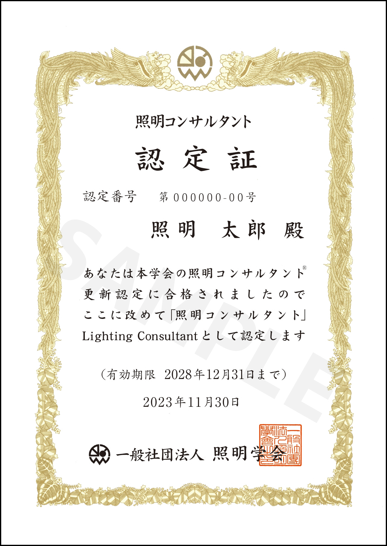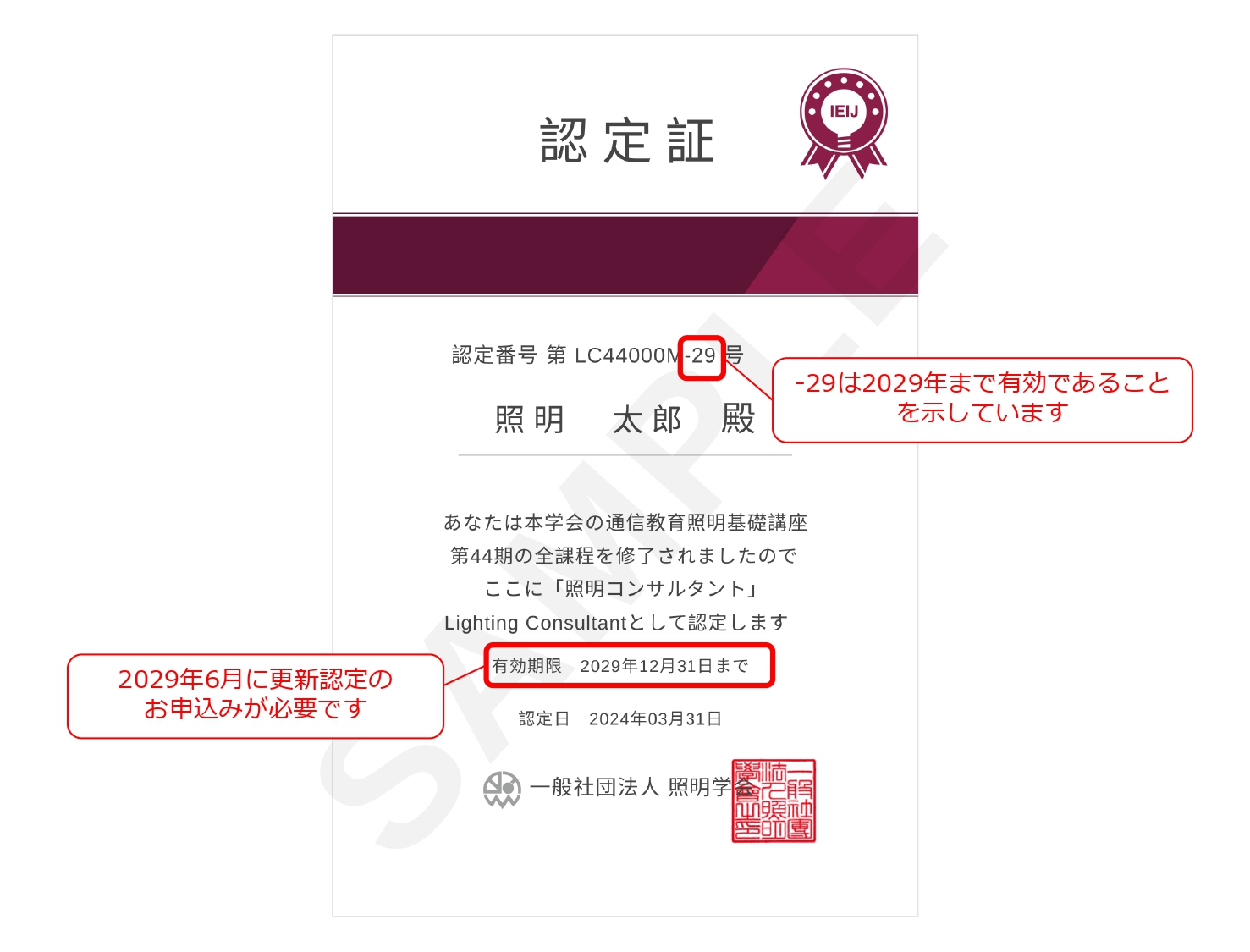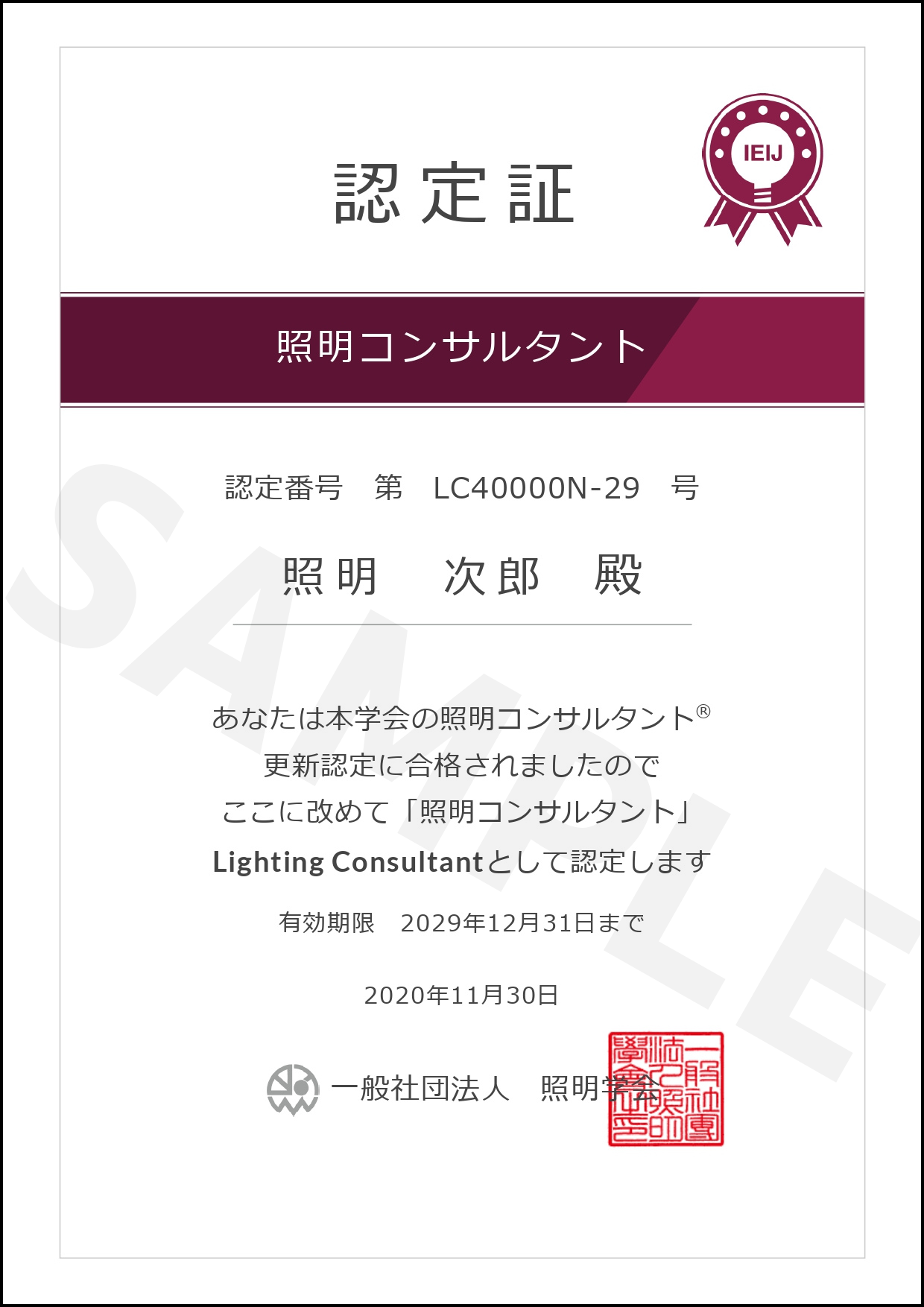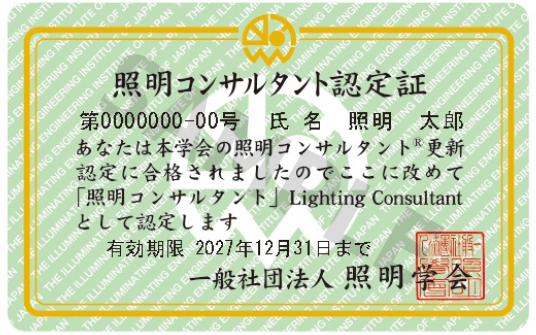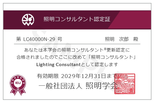- 2020年度(第41期)照明基礎講座の合格者(認定番号:41XXXX-26)。