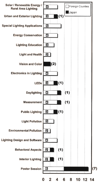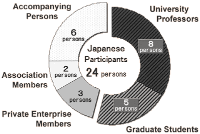 反面,図2から明らかなように,環太平洋照明会議の加盟国であるタイ王国,および香港(副議長就任)からの論文エントリーと参加者が皆無であったこと,国際組織委員の派遣が無かったことが国際組織委員会で問題視され,今後CIEなどの関係組織を介して改善を求めることとなった. 朝食時には,各自が得た市内散策成果などの情報交換をして,お互いに親睦を深めた. 図3にわが国から参加した24名の方々の所属別分類を示す.図3からも明らかなように,13名(54%)の方々が大学関係者(その内訳は,教員8名,大学院生5名)で,次いで3名(13%)の方が民間企業(技術者2名,照明デザイナー1名),2名(8%)の方が学協会関係者の順に続き,最後に同伴者が6名(25%)である.男女比は,男性17名(71%),女性7名(29%)である.また,比較的若手の研究者らの参加が多かったように感じた.海外で開催される国際会議に,指導教官が同行せずに大学院生らが単独で挑んでいる姿には,「時代が変わったものだ…」と驚かされた. |