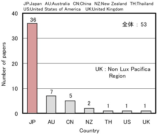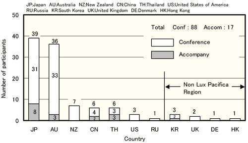 国別の参加者(登録者)数を図3に示す。Lux Pacificaの加盟国以外の国も含めて、合計10ヶ国から105名が参加した。このうち日本からの参加者は同伴者を含めると39名であり参加国中最も多かった。次いで開催国のオーストラリアの36名となっている。日本からの参加者数と論文発表件数は最も多く、大会の成功に大いに貢献した。