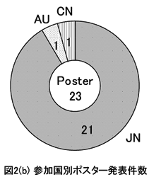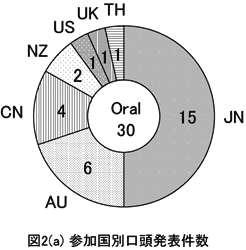 論文の全発表件数の53件は、口頭発表の30件とポスター発表の23件に分けられる(図2(a)、図2(b))。このうち日本からの発表は口頭発表が15件(全体の50%)、ポスター発表は21件(全体の90%)であった。わが国は、環太平洋地域の照明の学術・技術分野において、最も活発な情報発信国である。量的にはリーダーシップ的存在を担っている。
