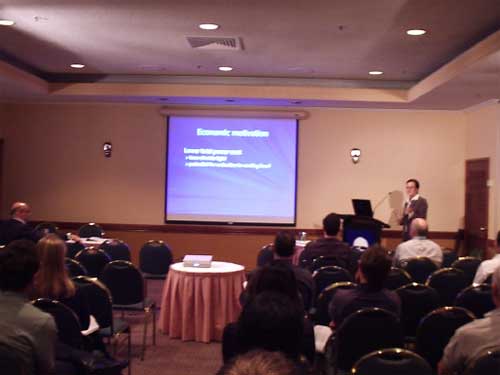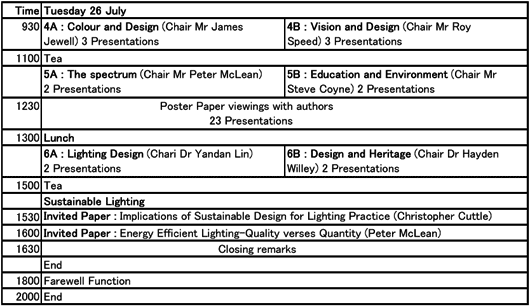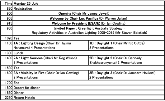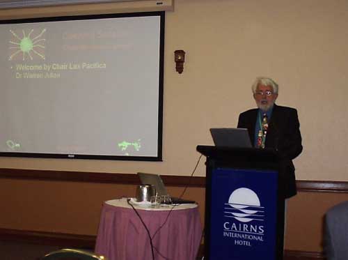 表2に二日間に及んだ大会プログラムの概要を示す。開会式はA会議室でJames Jewell氏の司会により行われた。まずJewell氏からLux Pacificaの沿革や目的などが紹介され、次にWarren Julian議長の開会の挨拶があった(図5)。次いで開催国のオーストラリア・ニュージーランド照明学会のIan Cowling会長から歓迎と祝辞の挨拶があった。