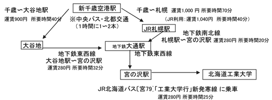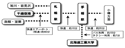| 手稲駅 | 「北口」より、循環バス乗車〔循環手48〕 運賃180円 所要時間10分 (行先は手稲駅北口発 手稲駅北口行になります) バス停「工業大学前」で下車 (バス会社はJR北海道バス) |