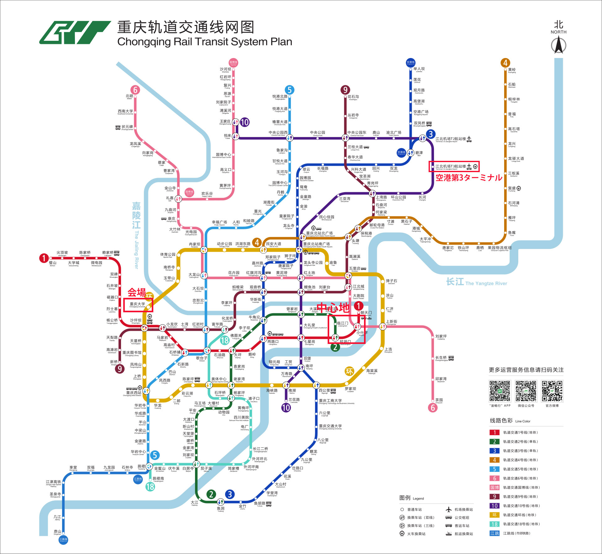 公共交通機関(地下鉄):重慶江北国際空港から軌道交通10号線まで約269m、蘭花麓駅方面に乗り、7駅目の重慶北駅南広場駅で下車。駅内で軌道交通環状線(反時計回り)、民安大道駅方面に乗り換え8駅目の重慶大学駅(1A出口)で下車します。チケット価格6人民元。
